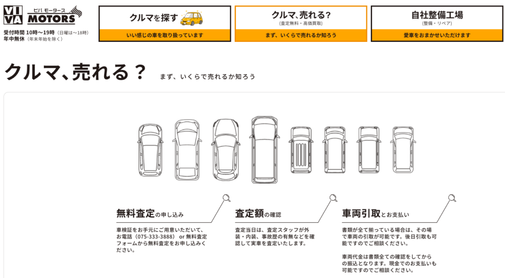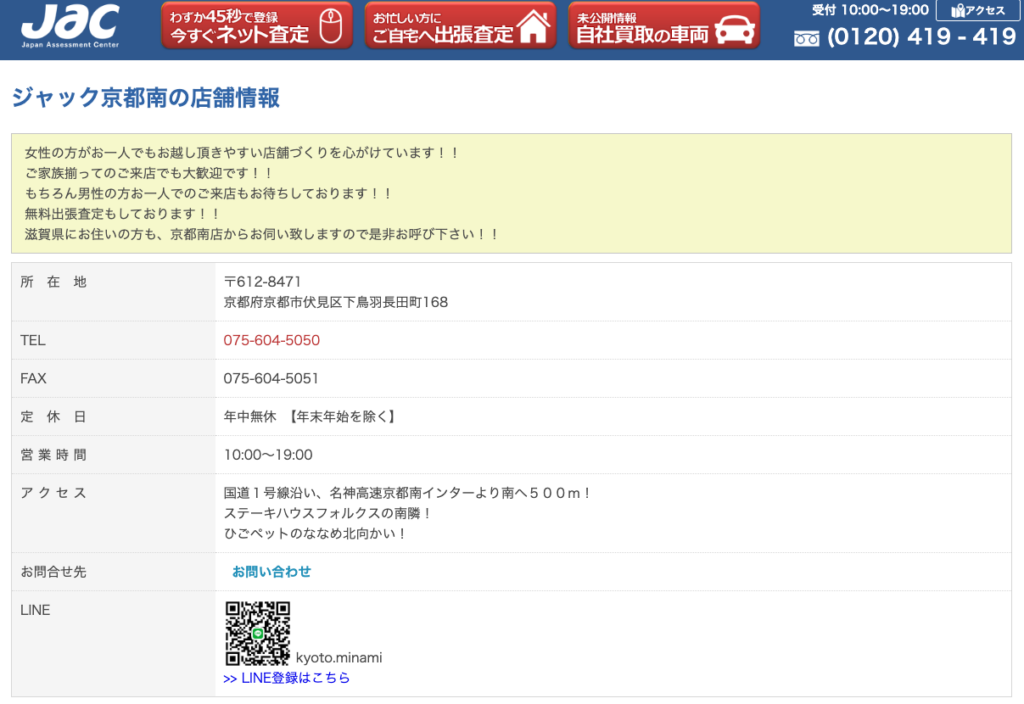 ジャック京都南は伏見区下鳥羽長田町にあり、1994年より無料出張査定を展開しています。買取した車をオークションに出さず自店で点検整備し直接販売することで、中間コストを削減している点が特徴です。