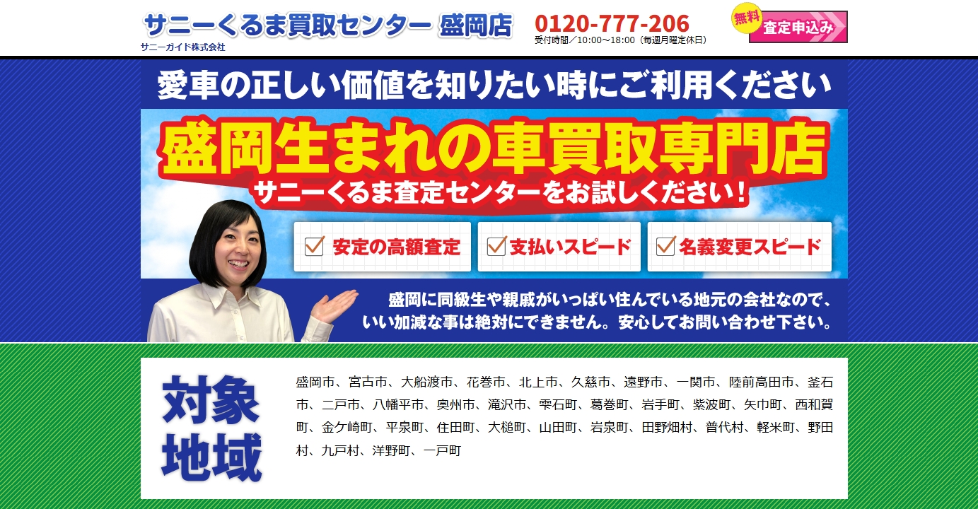 サニー車買取センター盛岡は、盛岡エリアに根ざした丁寧な査定対応が魅力です。地元で培ったネットワークを活かし、軽自動車から高級車まで、相場を踏まえたリアルな買取価格を提示してくれます。店舗スタッフの対応も誠実で、査定から手続きまで安心感のある取引ができると評判です。