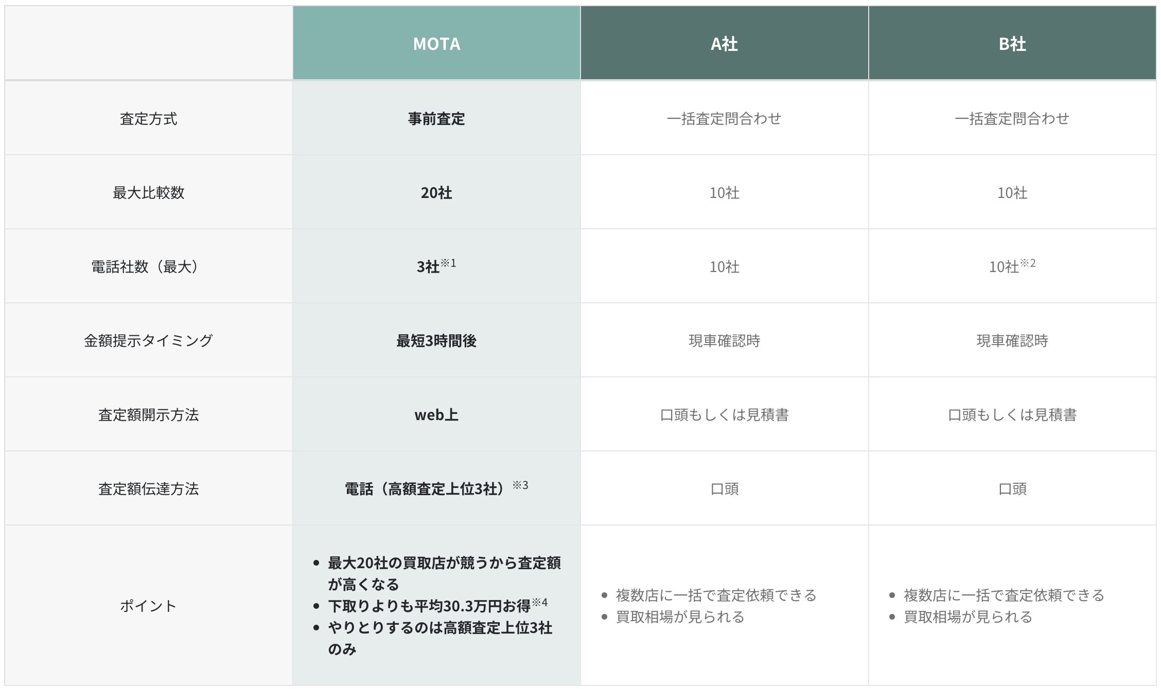 MOTA車買取の魅力は車一括査定サイトでながら、やりとりするのは高額買取上位3社のみであるため対応の面倒が軽減されている点です。一括査定の付き物である大量の営業電話を避けたい方におすすめで、さらにTOP3に掲載されるために競い合うことから他一括査定サイトよりも高額の査定が期待できます。