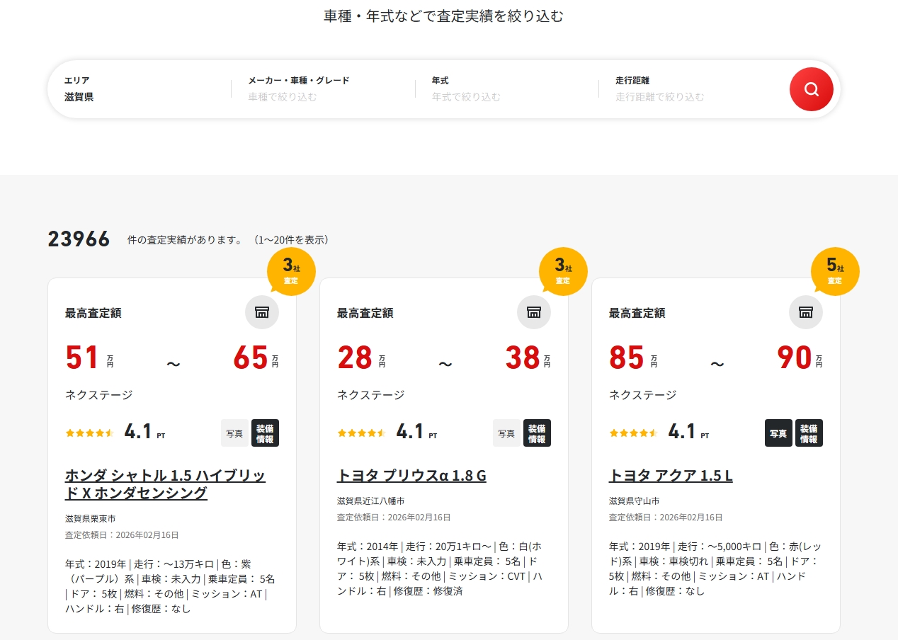 ネクステージは、滋賀の中古車買取で口コミ評価がずば抜けて高いです。無駄な交渉なし・高額査定・査定額保証が強みで、多くの滋賀ユーザーから支持されています。