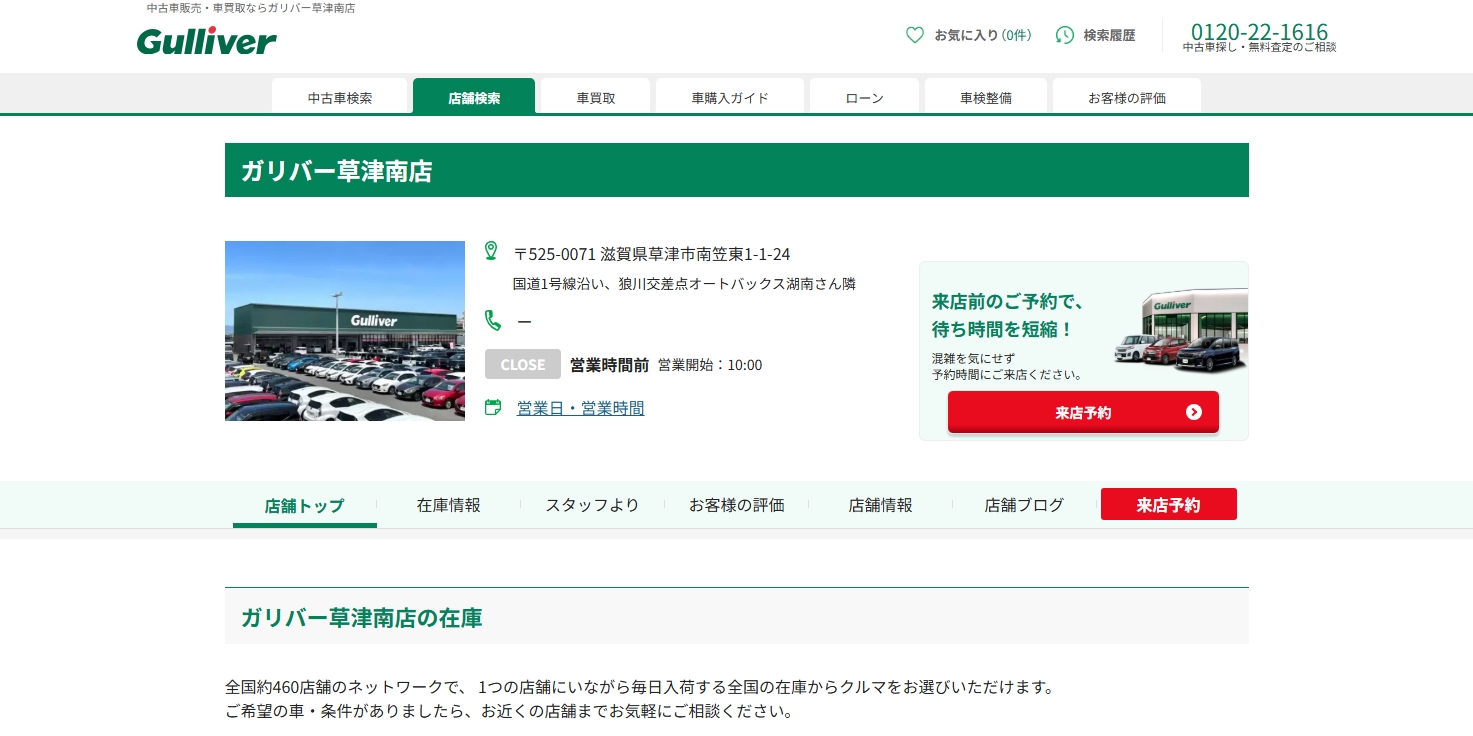 ガリバー草津南は、国道1号線沿いにありアクセスしやすい立地が魅力です。ガリバーは全国ネットワークの豊富販売網を活かして高価買取につなげており、滋賀県内でもとくに草津エリアでの信頼度が高い店です。店内では中古車の展示も充実しているため、買取だけでなく次の車探しまでスムーズに相談できます。