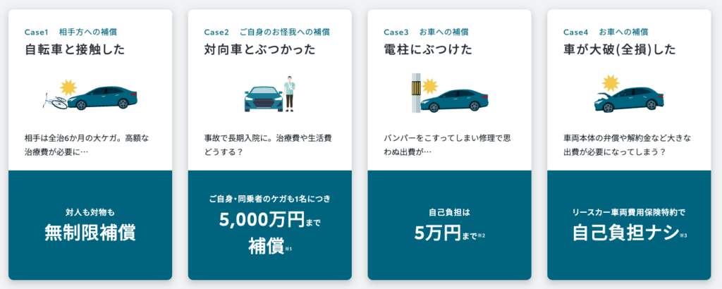 また、KINTOはリース料金に任意保険料が含まれており、事故などのトラブルに備えられる点が選ばれる理由のひとつです。たとえば、対向車との接触事故では最大5,000万円が補償され、事故時のレッカー車搬送にも対応しています。高知のような車利用が必須の地域では、任意保険が完備されているカーリースを選ぶことでより安心して利用できるでしょう。