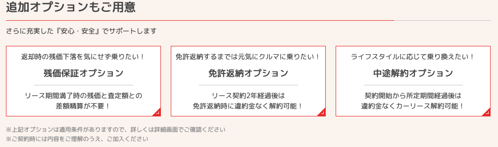 - 契約満了時の残価と査定額との差額精算が不要!「残価保証オプション」でリセールバリューを気にせず乗れる