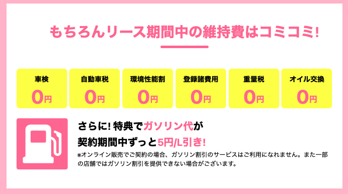 また、ニコノリは契約期間中いつでもガソリン代がリッター当たり5円引きになる特典も付いています。通勤やお子様の送迎などの日常使い、高知市外へのお出かけの頻度が多い場合でも維持費の節約になってお得です。ガソリン代の割引特典を長い間受けたい方や、1台の車を長く乗り続けたい方は、納車からマイカーとして利用できる「もらえるパック」の加入がおすすめです。
