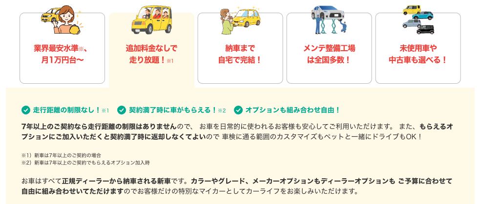 - 7年以上の長期契約なら「もらえるパック」で最終的にマイカーとして所有可能