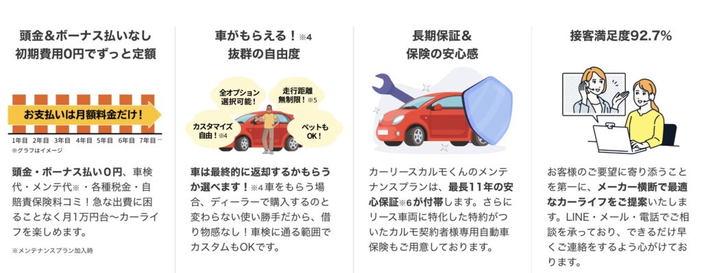取り扱い車種は国産メーカーのほぼ全車種に対応しており、軽自動車からミニバンまで幅広いニーズに応えられます。また、ボーナス払い無しのカーリースの中では最安と、実はコスパに優れているのも嬉しいポイントです。