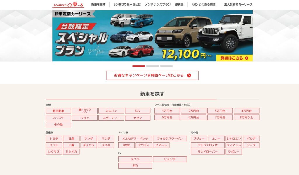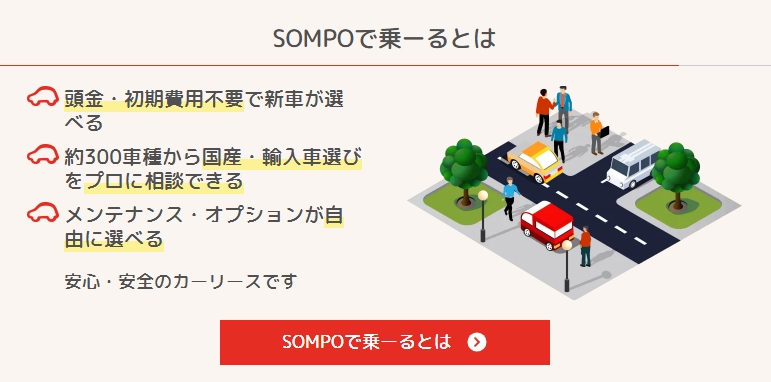 SOMPOで乗ーる(久留米市に納車可能)|車種が豊富でコスパも良いおすすめ1位!