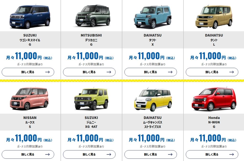 | 料金に含まれる項目 | ・車両代 ・重量税・自動車税 ・自賠責保険 ・車検費用 ・メンテナンス費用 |