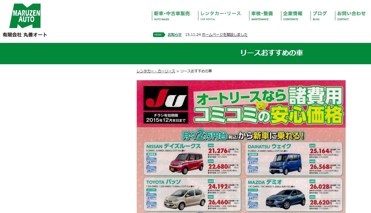 丸善オートは、リースだけでなく整備や車検にも対応できる整備工場を併設した安心のカーショップです。月々定額プランで新車に乗れるうえ、メンテナンスや点検も自社で一括管理できます。