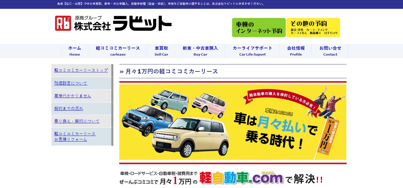 株式会社ラビットは、高価買取とカーリースの両方を展開する地域密着型の店舗です。すべての諸費用がコミコミの月々1万円から始められるカーリースとなっています。