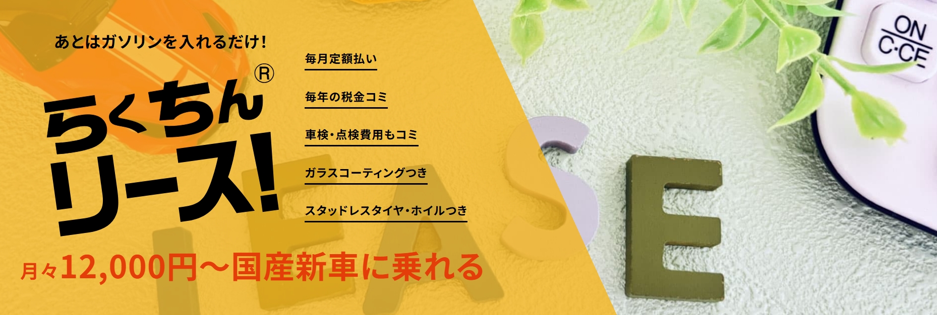 | 料金に含まれる項目 | ・車両代金 ・登録諸費用 ・各種税金 ・自賠責保険 ・メンテナンス費用 |
