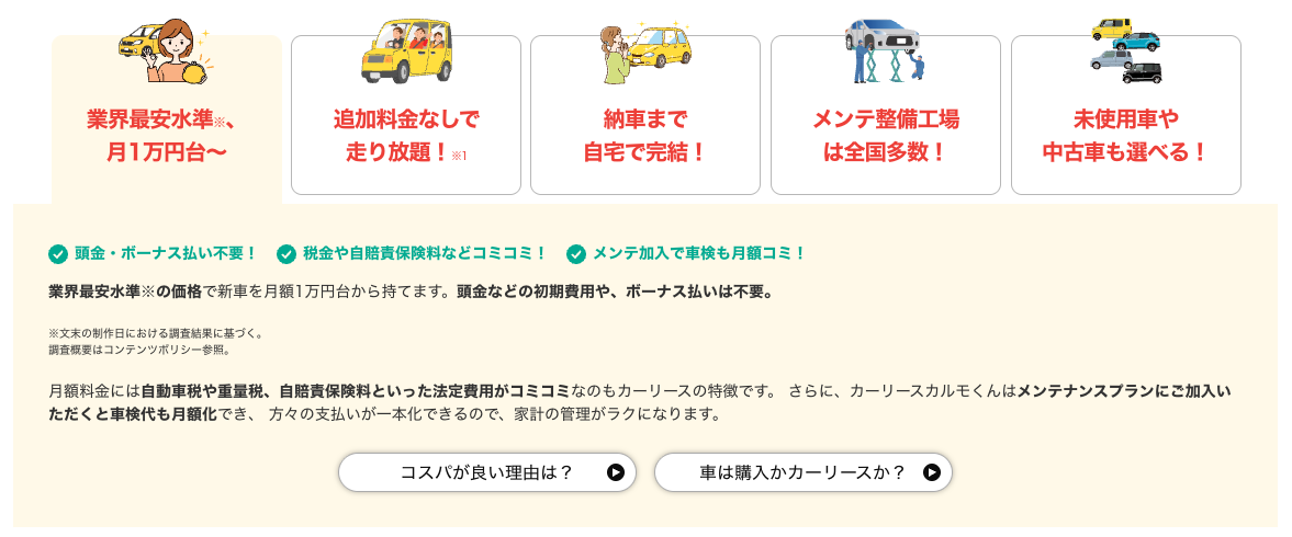 →定額カルモ君の詳細を見る - ニコノリは奈良最安値のリース料金が魅力!最大9年間の長期保証で安心カーライフ