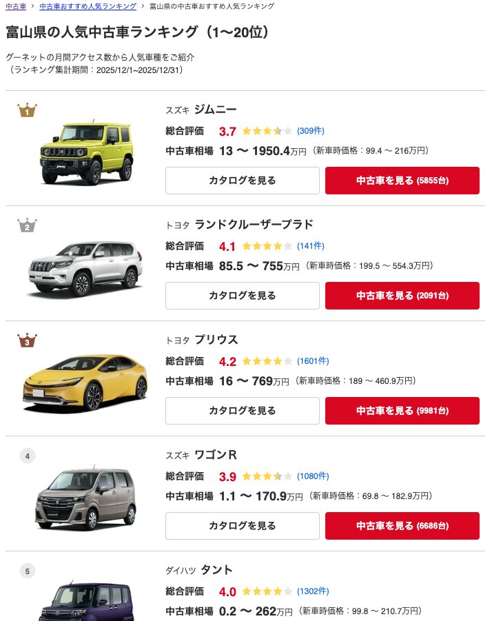 グーネットより、富山県の人気中古車ランキングの最新情報を掲載します。