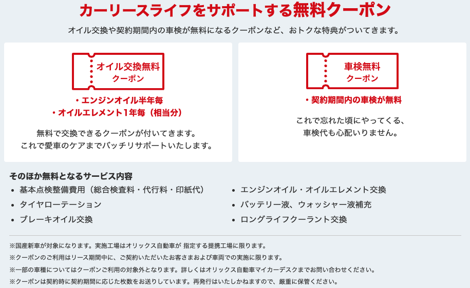 - リース期間中はオイル交換・車検費用が無料になるクーポンも付帯