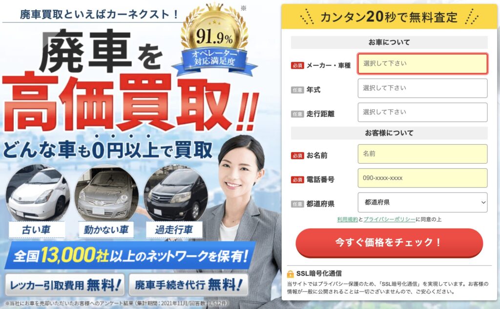 「大阪の廃車買取業者はどこがいいの?」とお悩みなら、まずはカーネクストに査定を出すことをおすすめします。あらゆる車を0円以上買取の安心感に加えて高価買取も実施中です。さらに廃車引取の全工程を無料で代行してくれる上に、WEB完結&20秒で査定が完了する速度感も弥勒です。