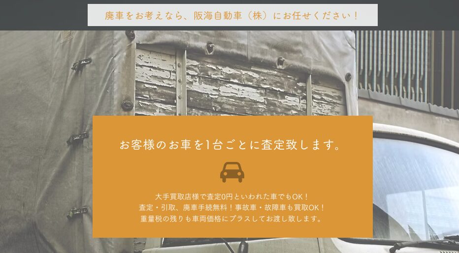 阪海自動車株式会社は大阪市東住吉区杭全に本社、住之江区南港東に南港支店を構え、大阪府内全域に対応する廃車買取業者です。中古車・事故車・不動車など幅広く買取対応し、自動車リサイクル法に対応した適正処理を行っています。査定・引取・廃車手続きは全て無料。丁寧で親切な対応が評価されています。
