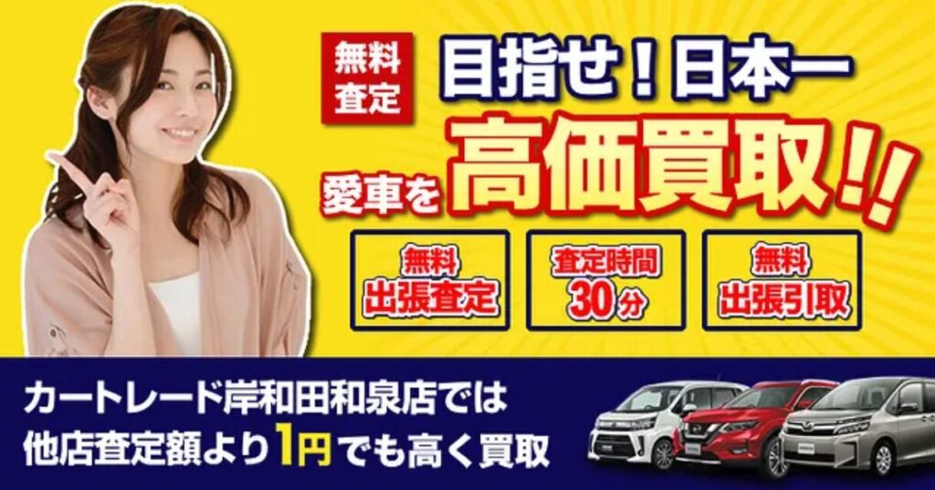 カートレード岸和田和泉店は株式会社石長グローバルモータースが運営し、岸和田市土生町に拠点を置く車買取専門店です。岸和田市・堺市・泉州地域でNO.1の買取金額を目指し、他店より1円でも高い買取をモットーにしています。ディーラーや大手買取店で実績を積んだ査定士が対応。廃車・事故車の出張査定・引取が無料で、30分のクイック査定に対応します。