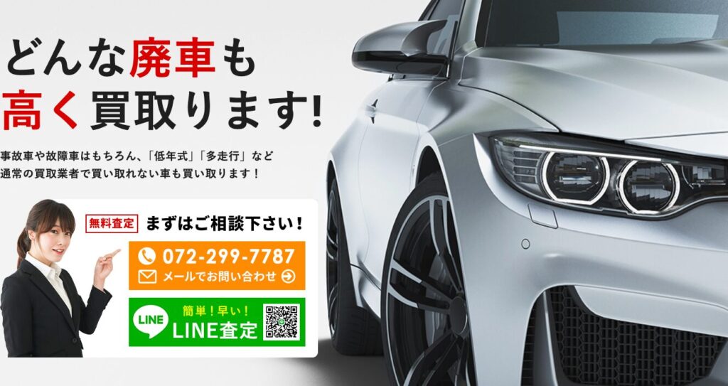 また大阪府内全域で最短翌日引取にも対応しています。24時間365日電話受付で夜間のトラブルにも即対応し、レッカー代・書類手続き・査定費用も全て無料です。もちろん税金還付ありで、不動者・水没者なども含めてあらゆる廃車を買い取ってくれます。