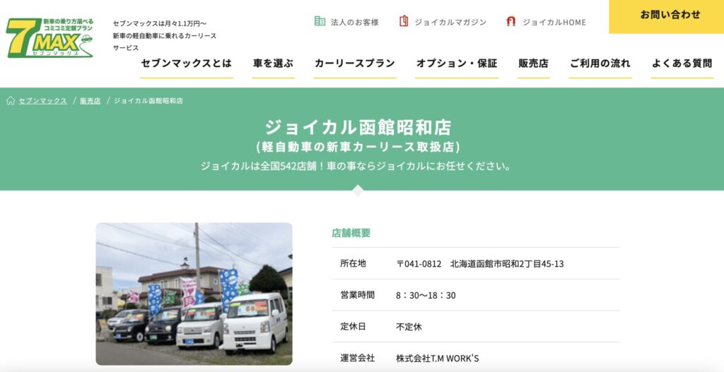 7位:ジョイカル函館昭和店(函館市昭和)は月1万円台から新車に乗れる全国チェーン